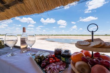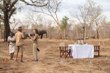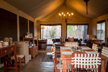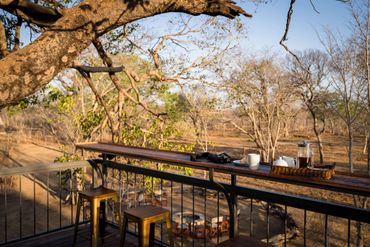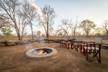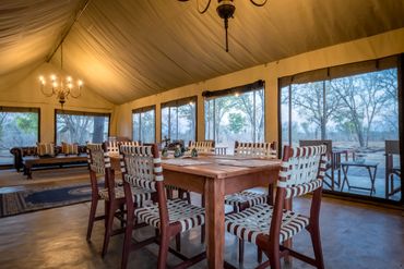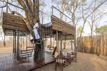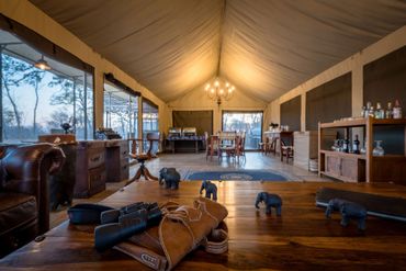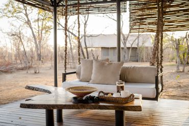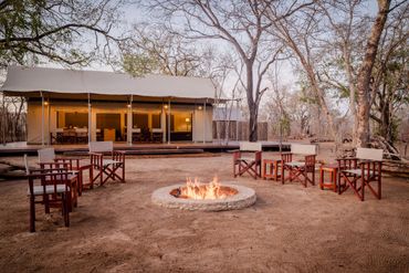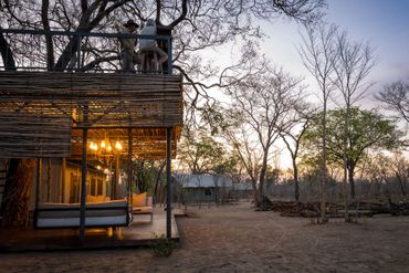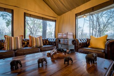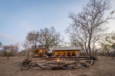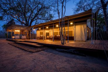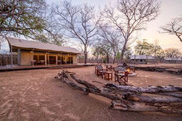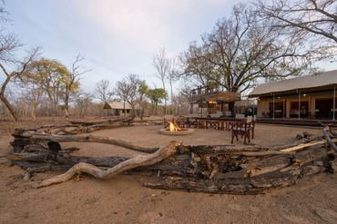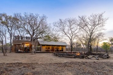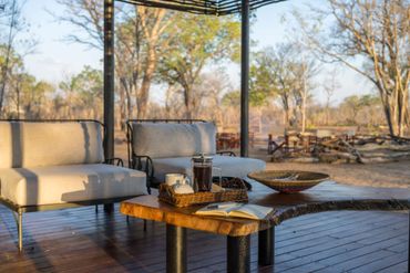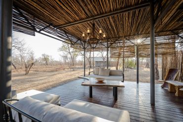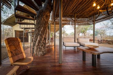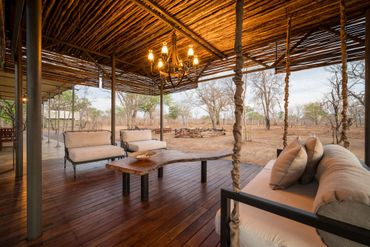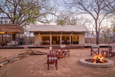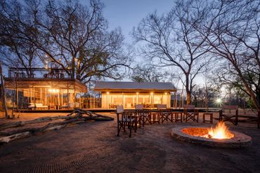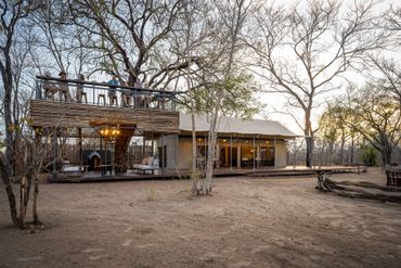 The camp’s lounge and dining area, adorned with teak furnishings and leather couches, opens onto a wooden deck overlooking the lapha and fireplace area. Above, a rooftop wildlife viewing deck offers an elevated perspective of the pristine landscape. Situated within the Zingweni Lion pride’s territory and alongside a nutrient-rich stream, the camp attracts large herds of elephants and diverse wildlife, creating unforgettable safari moments.